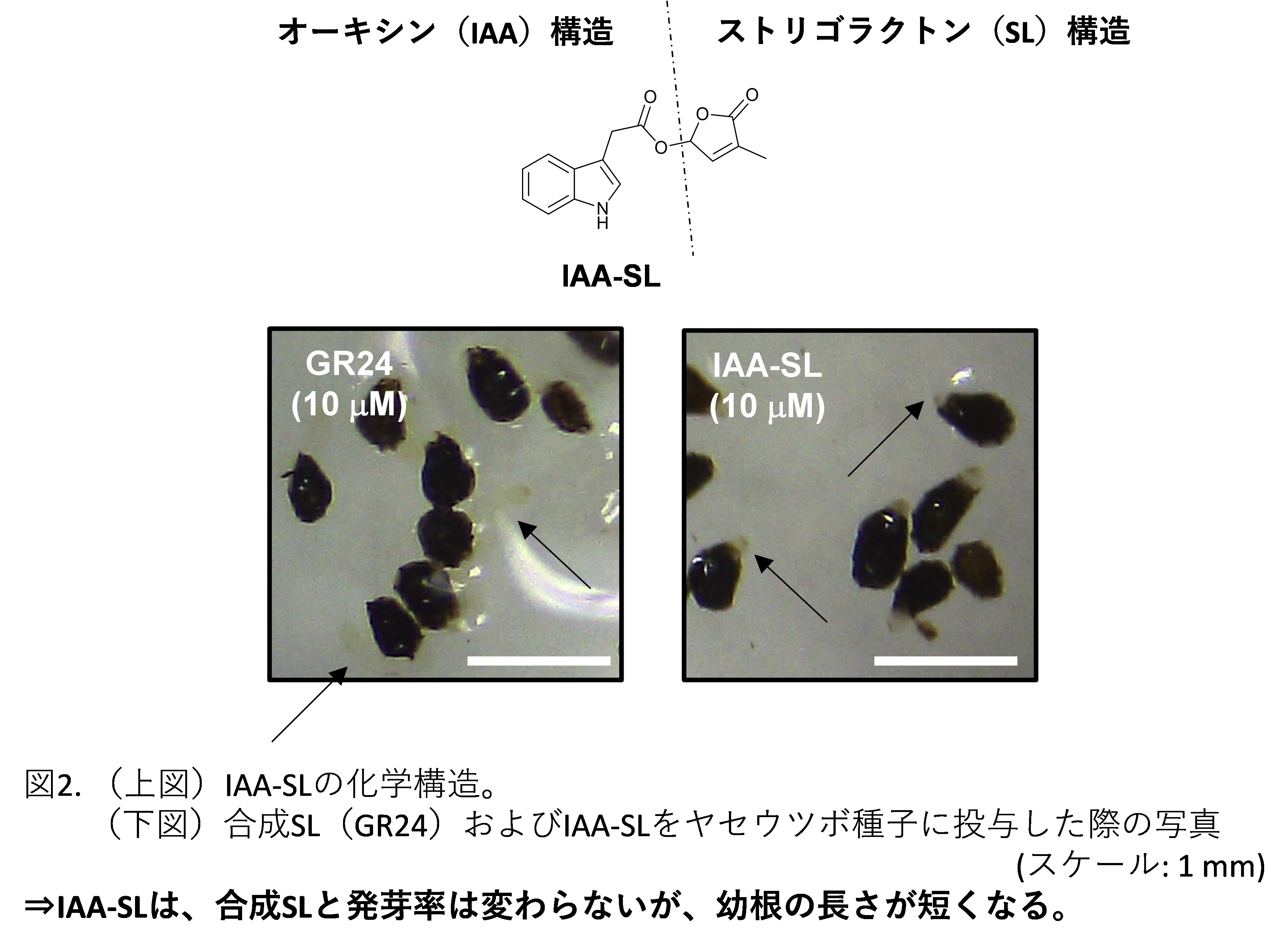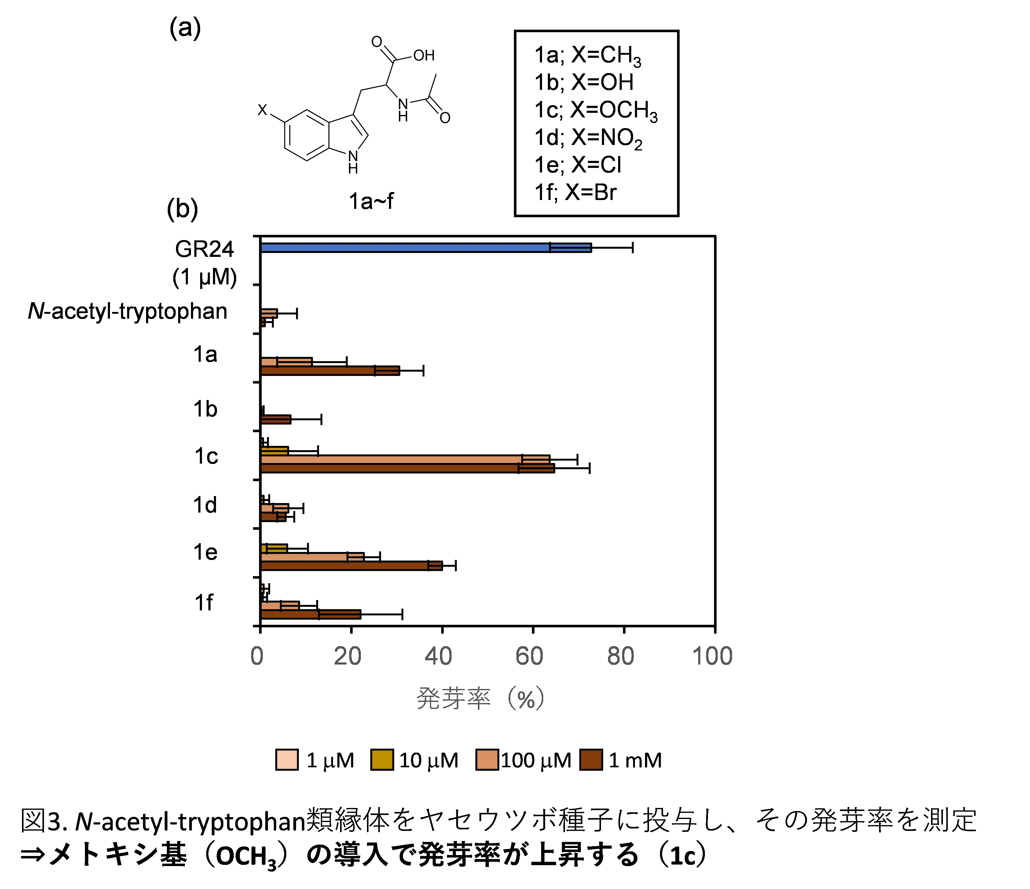 本研究グループは、根寄生植物の発芽を誘導できる微生物のスクリーニングに先立ち、微生物培養に用いる培地成分の影響について検討しました。その結果、窒素源として広く用いられているトリプトンがSL依存的なヤセウツボの発芽を阻害することを見出しました。その阻害成分について探索したところ、アミノ酸のひとつであるトリプトファン(Trp)であることを発見しました。続いて、トリプトファンと化学構造の似た化合物を入手し、根寄生植物種子に投与したところ、多くの分子が発芽を阻害することを見出しました。特に、Trpを生合成中間体として作られる植物ホルモンであるインドール-3-酢酸(IAA;オーキシン)は、強い発芽阻害活性や幼根伸長阻害活性を有していることが明らかとなりました。そこで、IAAにSLの部分構造を持たせたハイブリッド分子(IAA-SL、図2)を合成したところ、SLと同程度の発芽誘導活性を有しつつ、発芽後の幼根伸長を阻害することを見出しました。また、Trpのアミノ基をアセチル化した N-アセチルトリプトファン( N-acetyl-Trp、図1)は、発芽阻害作用は有していませんでしたが、根寄生植物種子の発芽を誘導するという興味深い現象を発見しました。しかしながら、活性が非常に弱かったため、インドール環に1の置換基を導入した誘導体を合成しました。その結果、置換基を導入した N-acetyl-Trpの中には、置換基を持たない分子と比べて、10~100倍程度活性が強くなる分子も存在しました(図3)。