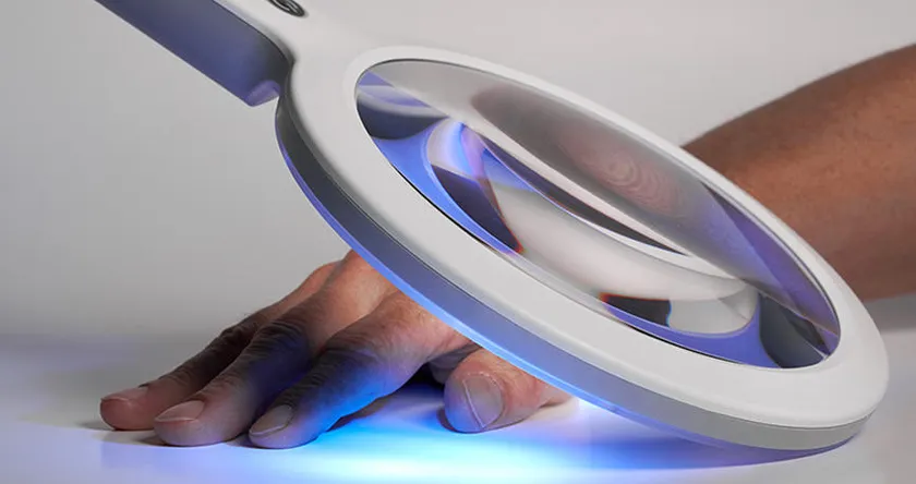軽量でコードレス使用が可能な「オプチラックス・ハンド」は、直径160mmの拡大レンズと明るく自然な均一光を照射する8,000ルクスLEDで「対象物をすみずみまでを見ることができる」とユーザー様に評判の充電式ハンディタイプLED検査照明です。「オプチラックス・ハンド 紫外線検査ライト」を皮膚に照射することで病変部の皮膚疾患や皮脂量を分かり易く可視化でき、手元のスイッチで白色光/紫外線の切り替えが可能です。