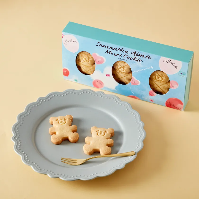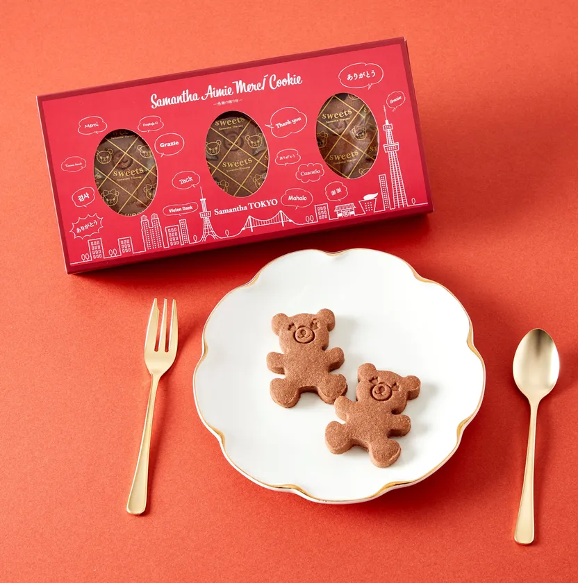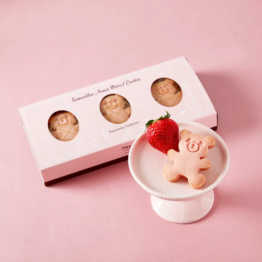 クッキーは、サマンサタバサ公式キャラクター、「アイミーベア」の形となっており、バター、ストロベリー、ショコラの3つのフレーバーをご用意。また、クッキーはすべて手作りで作られています。