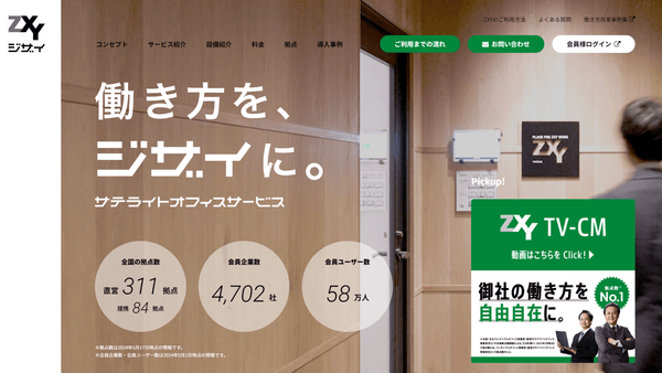 ザイマックス社が運営するZXY(ジザイ)は法人会員制のサテライトオフィスサービスです。全国で直営店が300箇所以上あり、従業員規模や業種に関わらず様々な企業が利用しており、契約企業数は4,200社・会員数は57万人(2024年1月時点)と非常に多くの方に利用されているサービスです。