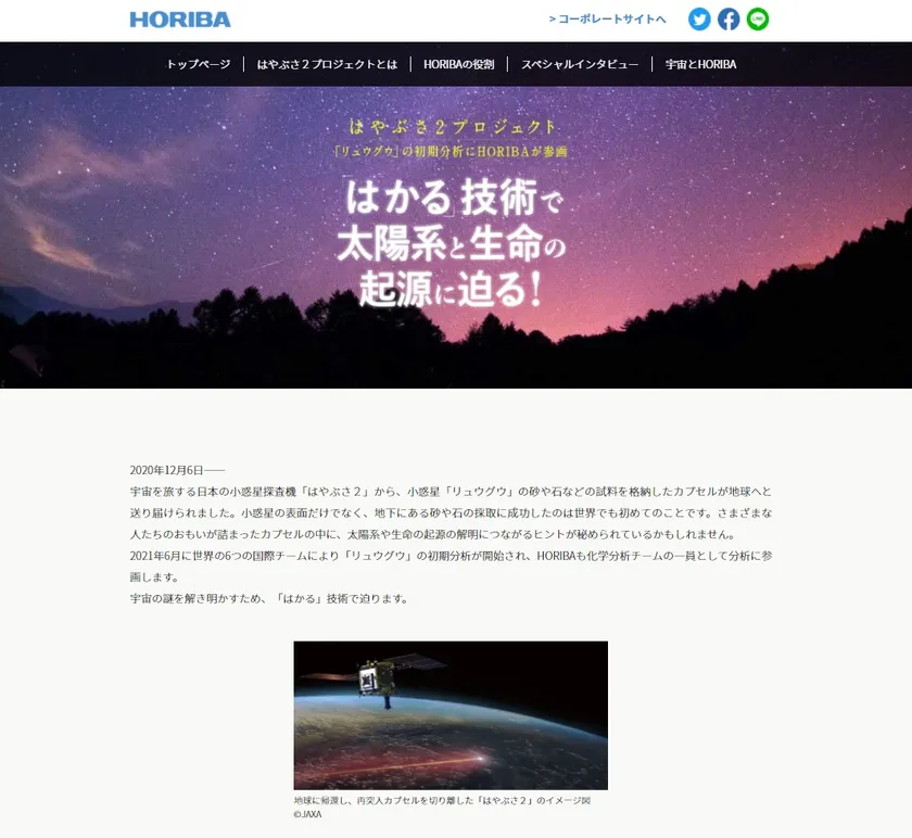 この度、HORIBAグループ(以下、HORIBA)は、はやぶさ2プロジェクトを通じて宇宙に関心を持った中高生から大人まで幅広い方々に向けて、初期分析の意義やプロジェクトに関わる科学者・技術者のおもいを紹介する特設ウェブサイト「はかる」技術で太陽系と生命の起源に迫る!を6月9日に公開しました。