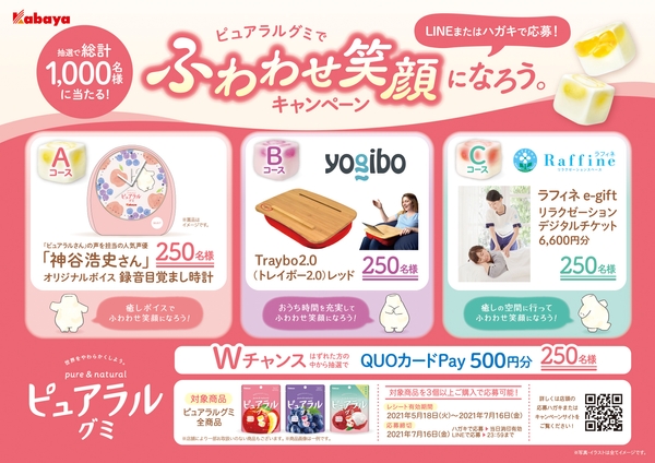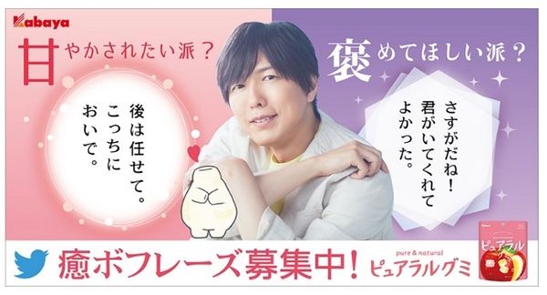 さらに、5月18日(火)から、ピュアラルグミを3個購入することで参加できる「ピュアラルグミでふわわせ笑顔になろう。キャンペーン」と、同月21日(金)からはピュアラルグミTwitterアカウント(@kabaya_pureral)から投稿される該当投稿から参加できる「#ピュアラルグミ癒ボフレーズ募集キャンペーン」を展開します。今回のWEBマンガ企画に登場する「ピュアラルさん」(CV「神谷浩史さん」)からのスペシャルボイスメッセージが当たります。