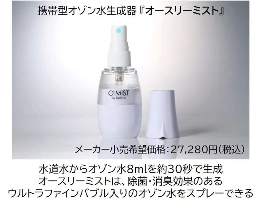 オースリーミストは、水のみでオゾン水を生成することができ、ふきかける場所を選びません。日常生活潜む不安を解消できる機器として、一人一台オゾン水を携帯する、という新たな体験を今回の感染症対策総合展で提案していきたいと思います。