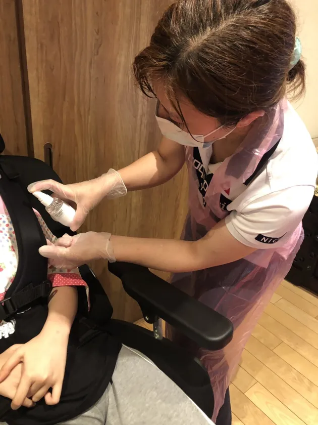 村上さんが訪問している知的障がい者の移動介助では、使用される車いすの固定ベルトや座面の除菌に、オースリーミストで生成したオゾン水をふきかけています。利用者によっては、ベルトを口に入れてしまうこともあり、それまで除菌剤の成分を気にかけていました。水から生成されたオゾン水での除菌にかえてからは、利用者が乗る直前に使ってもアルコール臭がなく快適で、安心感があり、さらに、万が一目や口に入っても問題ないため、利用者が乗っているときでも、気になった際にオースリーミストでスプレー可能です。車いすから降りた後は、広い座面とベルト部分に、1回生成の満量(約8ml)でぴったりとのこと。車いすは、各自の体に合わせたオーダーメイドで作られていて、移動中に体がずれないように密着しているので、降りてすぐにスプレーするだけで除菌できるのは、負担軽減につながるとのことでした。