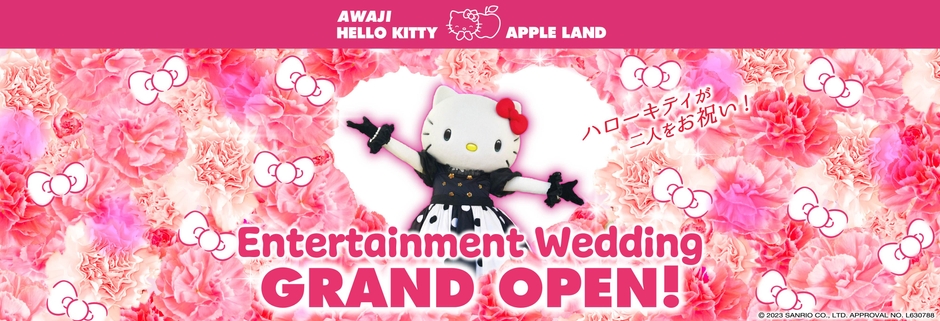 ショーやグリーティング、食事やショッピングを通じて、株式会社サンリオのキャラクター「ハローキティ」の世界を存分に楽しめる「AWAJI HELLO KITTY APPLE LAND」では、ハローキティと一緒に結婚式をお祝いできるウェディングプラン『エンターテイメントウェディング』の申込受付を1月24日(火)より開始いたします。
