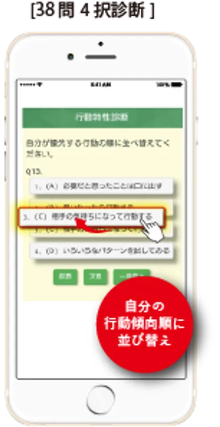 ◎特徴1. コンピテンシー(行動特性)で診断する主観を排除した38問4択の新しいタイプの適性診断