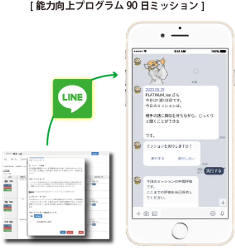 診断結果の出力のみで完了する適性診断が多いなか、VANTAGEは診断結果を元に対象者個別に職業能力値を向上させるための行動支援プログラムを自動生成し、90日間LINEアプリにより配信します。これにより対象者の行動習慣の変容を促すことで、職業能力向上、人材育成に寄与します。
