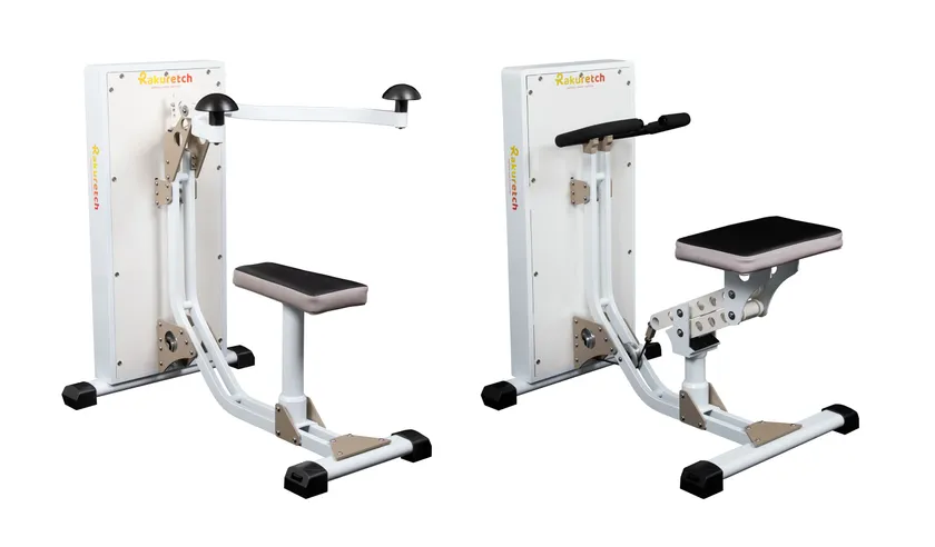 「Rakuretch」は肩甲骨・股関節回りを中心に凝り固まった筋肉をバネの振動で動的にゆるめることで、その人が本来持っているしなやかな身体を取り戻します。