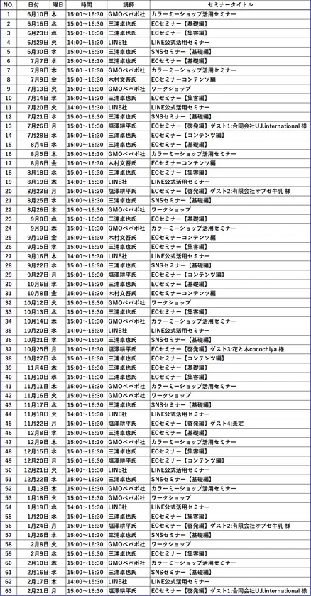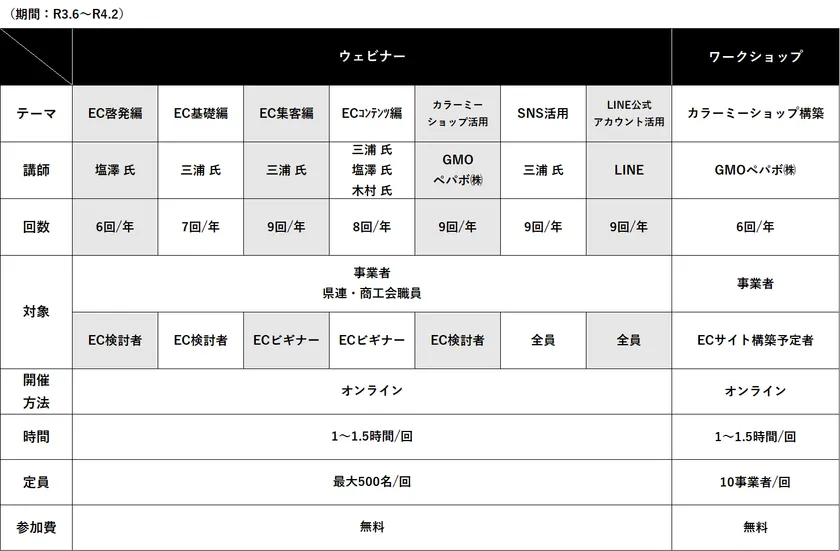 全国連では、そのような課題を解決するため、ECに関する各種セミナーやワークショップを実施することといたしました(全63回)。実際にECを活用している中小・小規模事業者にも講師として参加いただき、EC化の必要性を同じ事業者の立場から伝えていただきます。知識の習得からEC立ち上げ、ブランディングや集客、SNSとの連携など、ECを活用して販路を拡大させ、売上を増加させるために必要なセミナーもご準備しています。セミナー・ワークショップはすべてオンライン開催となりますが、チャットで質問を行うことができ、その質問に対し講師が回答いたします。