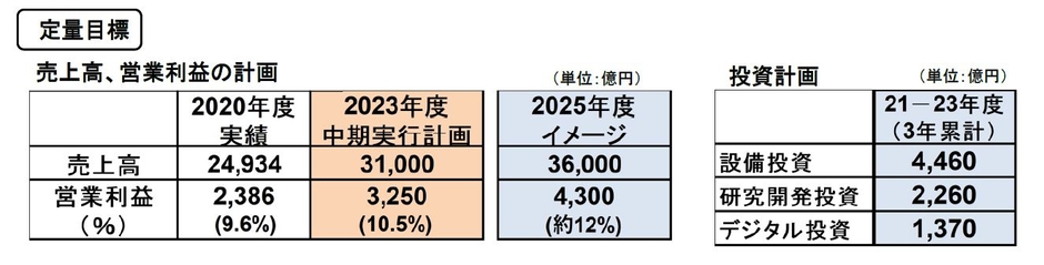 定量目標は、2023年度の中期実行計画として、売上高3兆1,000億円、営業利益率10.5%とし、さらなる事業拡大に向け、8,000億円を超える投資を実行します。また、2025年度にありたい姿として、売上高3兆6,000億円、営業利益4,300億円(営業利益率約12%)をめざします。