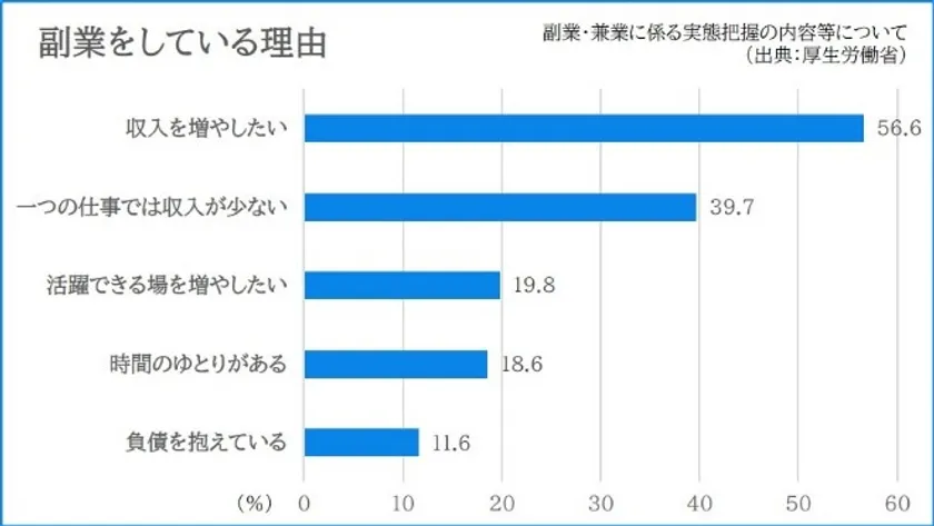 2020年に厚生労働省が行った調査によると、本業とは別に仕事をする“副業”をしている人の数は全体の9.7%。つまり約10人に1人が副業をしており、その理由としては「収入を増やしたいから」「一つの仕事だけでは収入が少なすぎて生活ができないから」など経済的理由が大半を占めていることがわかりました。
