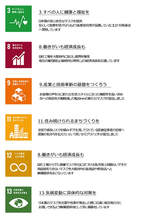 当社は「「マスクでつながるプロジェクト・MASK AID」と同様に、「マスクでSDGs(持続可能な開発目標)達成に向け貢献する」を掲げ、この目標に賛同致します。
