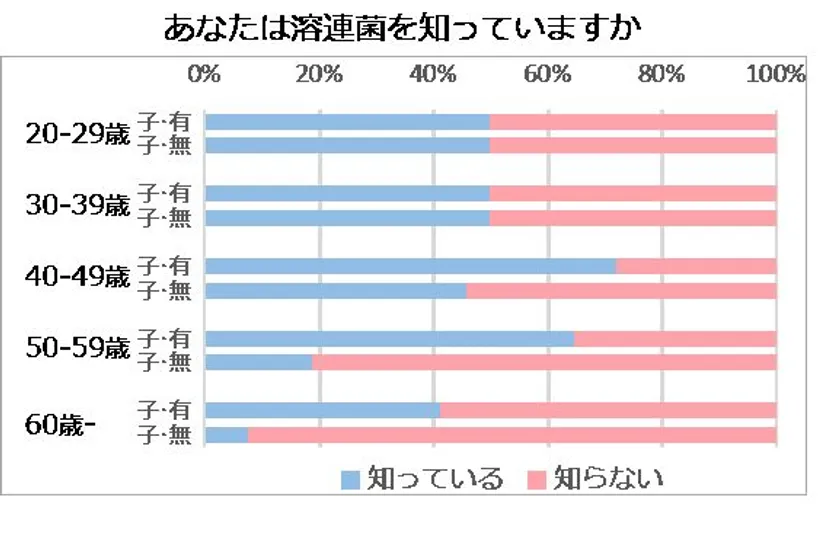 当センターの調査では、40-59歳で子どもがいる回答者は約7割が溶連菌のことを「知っている」と回答しました。一方で、50歳代で子供がいない人や60歳以上の人では、6割以上が「知らない」と回答しました。