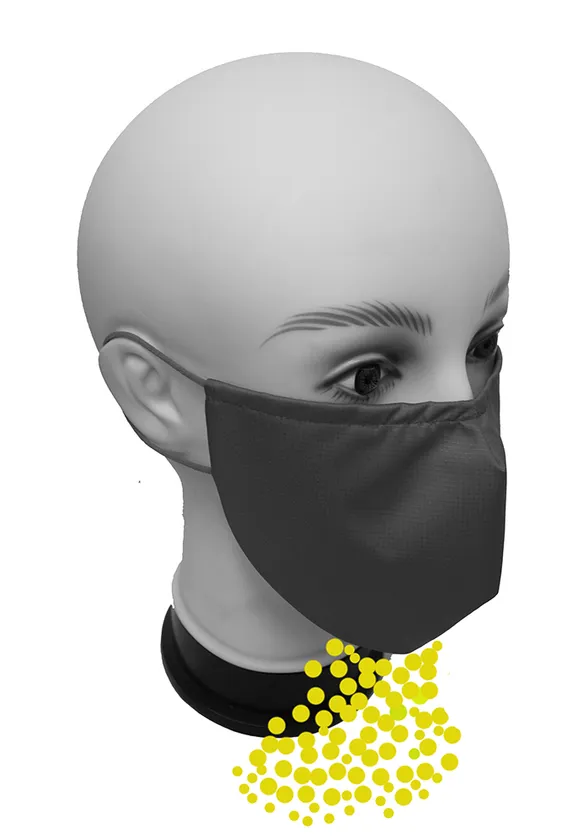 この写真の通り、このマスクは口の下部に適切な大きさの隙間を設けることにより、呼吸が大変しやすくなっており、蒸れたりしません。マスクの表生地には、強撥水ポリエステル生地を採用し、マスク面の飛沫の通過は全くない安全性の高い設計になっております。