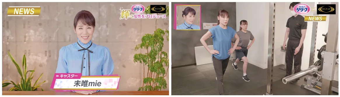 本プロジェクトに挑戦した参加者のビフォーアフターをまとめたWEB限定動画『リリーフ アクティブ吸水ショーツ× RIZAPニュース』を2021年6月10日(木)より公開いたします。動画では、応援アンバサダーを務める未唯mieさんが初のキャスター役に挑戦。参加者がどのような想いでプロジェクトに参加し、どのようなトレーニングを経て、どのように変化したのかを見届けます。また、未唯mieさんは、参加者が挑戦したトレーニングを実際に体験。今も昔も変わらない引き締まった美ボディを披露しました。動画に出演する4名の参加者のウエスト合計は、なんとマイナス51.5cm※1に成功。その衝撃のビフォーアフター姿にもご注目ください。
