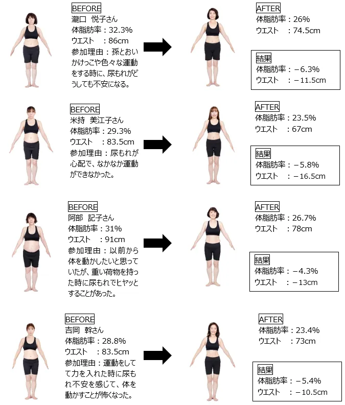 ※体験者4名(瀧口悦子さん、米持美江子さん、阿部記子さん、吉岡幹さん)のRIZAPプログラム実施期間は2ヶ月間になります。※瀧口悦子さん、吉岡幹さんの年齢はRIZAPの集計データの年齢範囲を上回っています。※ウエスト数値は、RIZAPが定める測定方法によってへそ周りを計測しています。※体験者4名のウエスト数値、米持美江子さんの体脂肪率はRIZAP統計数値のスタート時の範囲を下回っています。※RIZAPのプログラム体験者46名(24~66歳、平均年齢45.8±10.9歳)の数値を統計処理した結果、2ヶ月間で体脂肪率37.67%±8.93から31.84%±9.78に減少。確率的に可能な数値変化の幅(四分位法による)は-10.29%〜-1.39%であり(実績値、2020年9月日本臨床試験協会調べ)2ヶ月後この範囲に収まらない者の割合は4.35%です。※RIZAPのプログラム体験者27名(47~66歳、平均年齢53.6±4.5歳)の数値を統計処理した結果、2ヶ月間でウエスト105.19cm±10.28から95.82cm±9.12に減少。確率的に可能な数値変化の幅(四分位法による)は-17.80cm〜-0.58cmであり(実績値、2020年9月日本臨床試験協会調べ)2ヶ月後この範囲に収まらない者の割合は0.00%です。