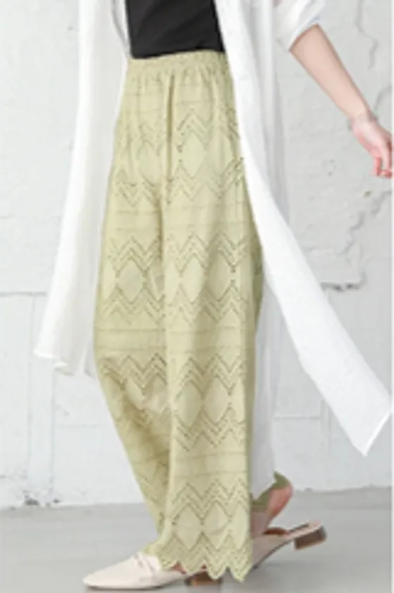 軽やかでリラックスムードの漂うエレガントなレースシアーパンツ。膝辺りまでさらりとした裏地付きで、履き心地アップと透け感防止を叶えてくれます。レトロシックでフェミニンな印象のカットワークレースを大胆に使用したワイドパンツは、1枚でコーデの主役にはもちろん、ワンピースやスカートの下に合わせてレイヤードスタイルにもぴったり。トレンドのシアー素材が、履くだけでこなれた雰囲気と季節感を与えてくれます。