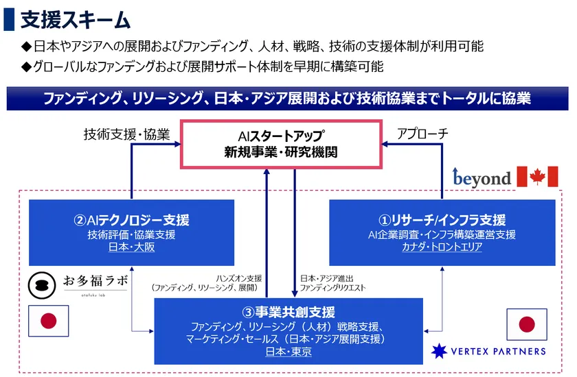 大阪のAI(人工知能)開発事業を展開する株式会社お多福lab(本社:大阪市西区、代表取締役社長:浜道 崇)は、カナダAIスタートアップ企業のアジアおよびグローバル展開を実現するためスタートアップ企業との事業共創の実績を豊富に持つ「株式会社ベルテクス・パートナーズ(本社:東京都港区、代表取締役:山口 正智)」、およびクラウド/サーバー事業を提供する「株式会社ビヨンド(本社:大阪市浪速区、代表取締役:原岡 昌寛)」と、事業共創分野でのグローバルパートナーシップを実現するためMoU(覚書)を締結しました。