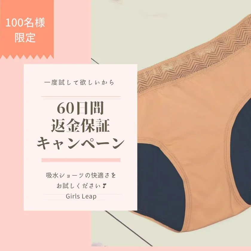 そこで、新しいフェムケア商品である吸水型サニタリーショーツを消費者の方々にリスクなく手に取っていただくため、60日間返金保証の「Girls Leap トライキャンペーン」を開始いたします。