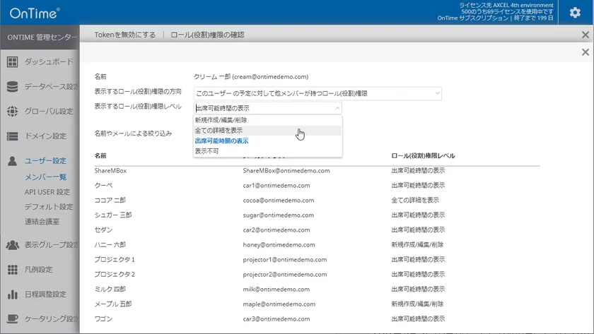 OnTimeでは従来よりExchangeやOutlookで付与したアクセス権限とは別にOnTime内で付与できる便利なロール権限機能があります。本バージョンからどのような権限付与がなされているか閲覧側、閲覧される側の双方向で確認できる機能をOnTime管理センターに実装しました。