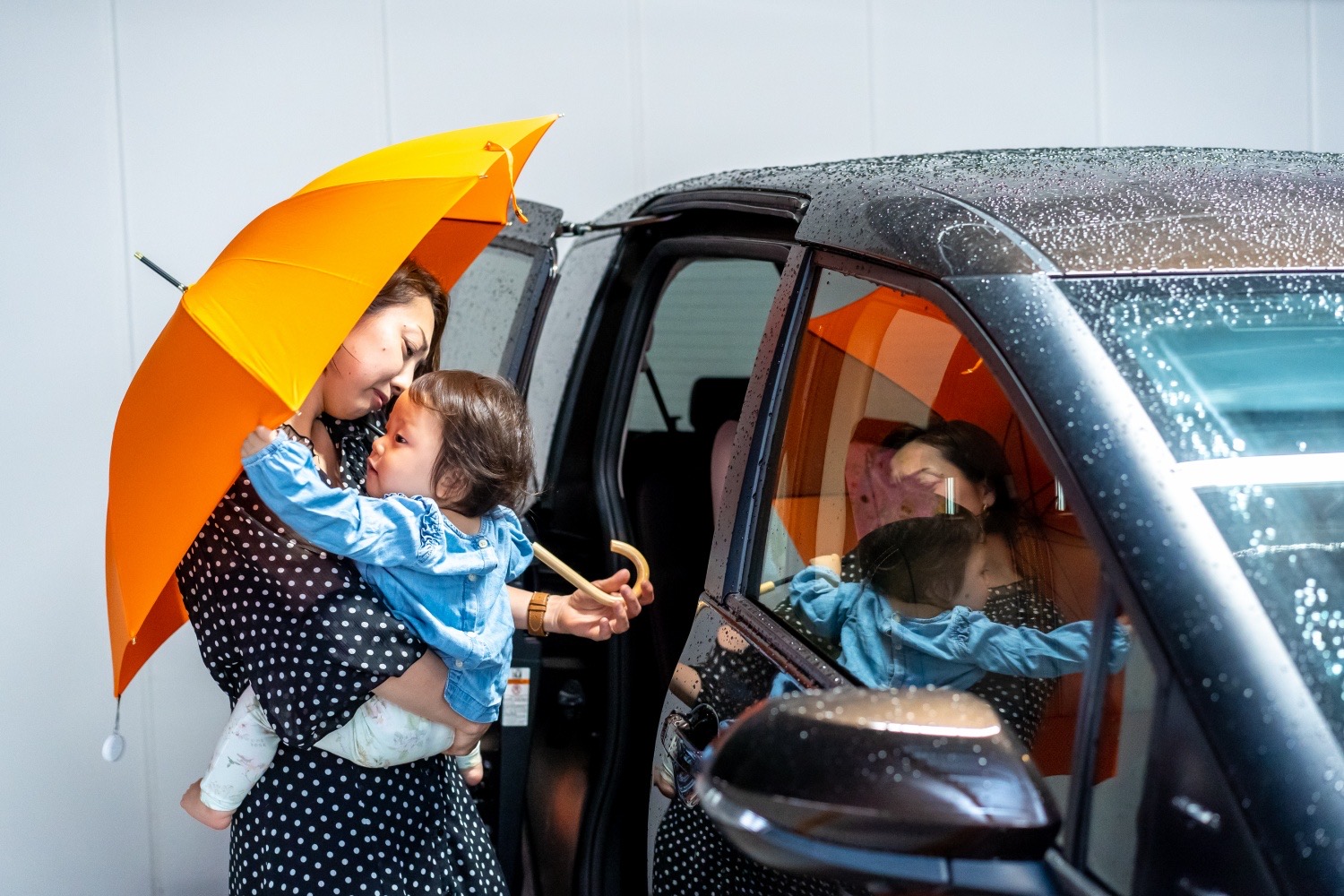 Choitoは特に子育て世代に多い“あるある”の悩みを解決する為に生まれた、傘専用のマグネットストラップです。傘にChoitoを取り付けるだけで、車の天井にピタッとくっついて傘が屋根がわりになります。