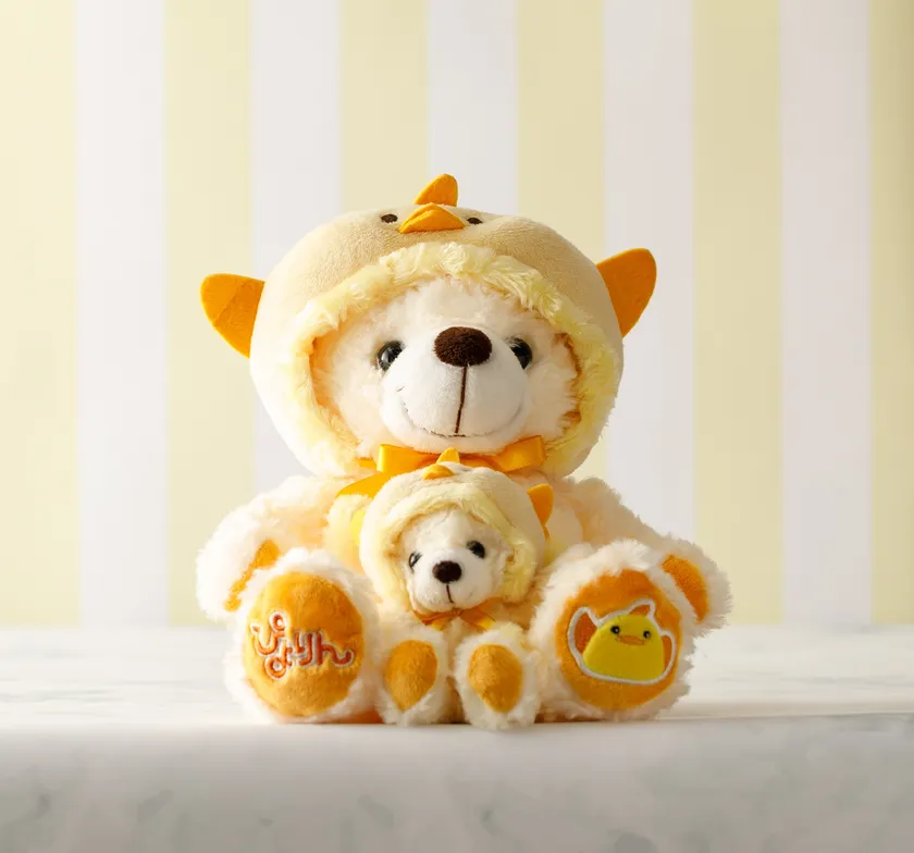 ぴよりんがクマのぬいぐるみにかぶられちゃいました。実店舗だけでなく、ぴよりんマルシェで、ネットからも購入いただけます。