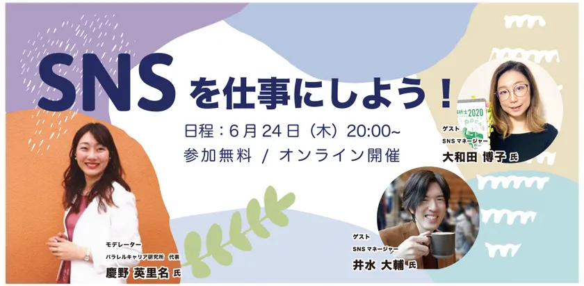 モデレーターには、パラレルキャリア研究所を主催する慶野 英里名(けいの えりな)さんを招き、SNS運用マネージャーの認定講座&試験を行う井水 大輔さん、STUDIO横浜のトレーナーでSNS運用実績のある大和田 博子さんをお招きして、SNSでビジネスやキャリアを充実させるヒントについて考えます!将来はSNSを仕事にしたい方、ソーシャルコマースを考えている方、広報PRとしての運営マネージャーのスキルを得たい方、PRや集客に悩むビジネスパーソンの方向けのセミナーです。