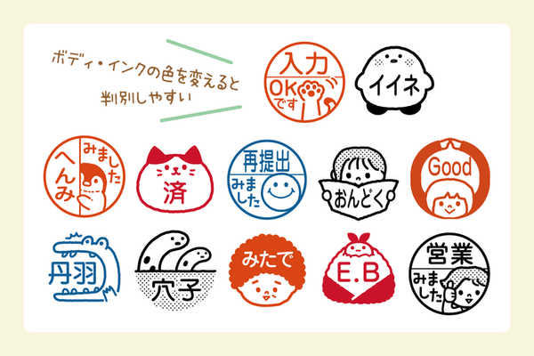 2025年1月に新しいデザインを追加した「みましたスタンプ」。お子さまの連絡帳や音読カードのサイン、塾や学校の先生が提出物に押す確認印に使える、かわいいイラスト入り印鑑です。回覧板のサインやオフィスでのチェック印などにもオススメです。