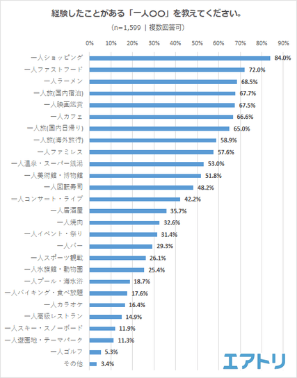 最も多かったのは1 位が「ショッピング」(84.0%)で、2 位が「一人ファストフード」(72.0%)、3 位が「一人ラーメン」(68.5%)でした。