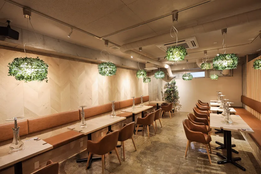 シーシャ専門店 チルイン秋葉原2号店は、“次世代型のシーシャ環境”を模索するチルインの実験店舗。アキバ感満載の1号店と対照的な、ベージュの壁にグリーンを這わせた、明るいカフェ風の内装に仕上げました。