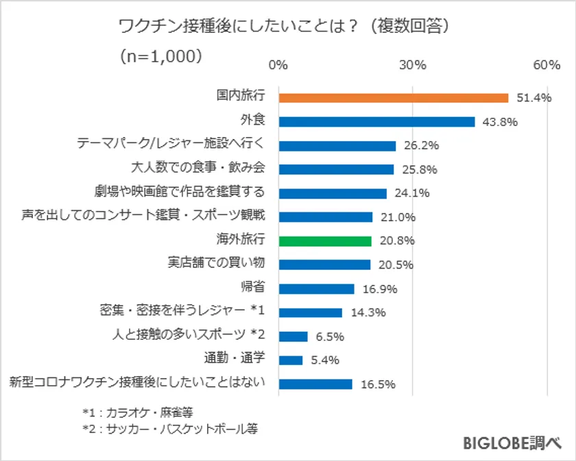 全国の20代から60代の男女1,000人に「新型コロナワクチン接種後にしたいこと」を質問したところ、「国内旅行」(51.4%)、「外食」(43.8%)という結果となった。同じ旅行でも「海外旅行」と回答した人は20.8%と「国内旅行」の半分以下であった。