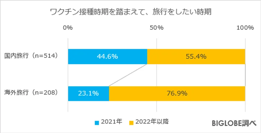 上記調査で「国内旅行」「海外旅行」と回答した人に「ワクチン接種時期を踏まえて、旅行をしたい時期」を質問したところ、「国内旅行」と回答した人は今年(2021年)が44.6%であったのに対して、「海外旅行」と回答した人は23.1%と、「国内旅行」の半分に近い割合となった。