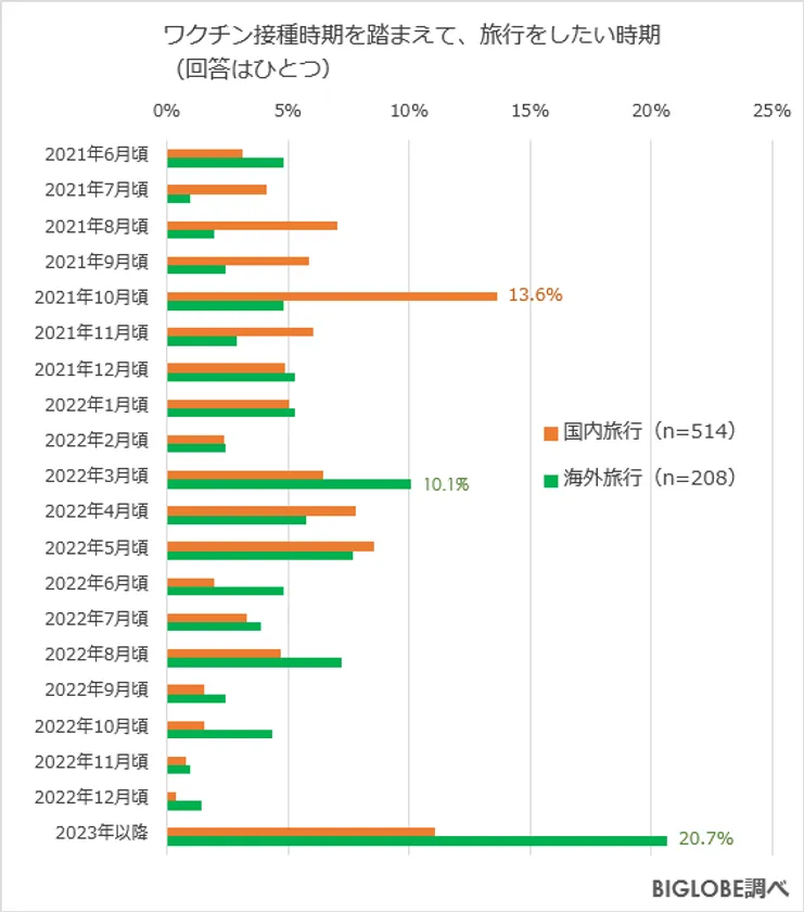 「国内旅行」行きたい時期は10月、「海外旅行」は来年以降 BIGLOBEが「ワクチン接種後の生活に関する調査」第2弾を発表 ~ワクチン接種後のGo Toキャンペーンは、利用希望が7割弱に~