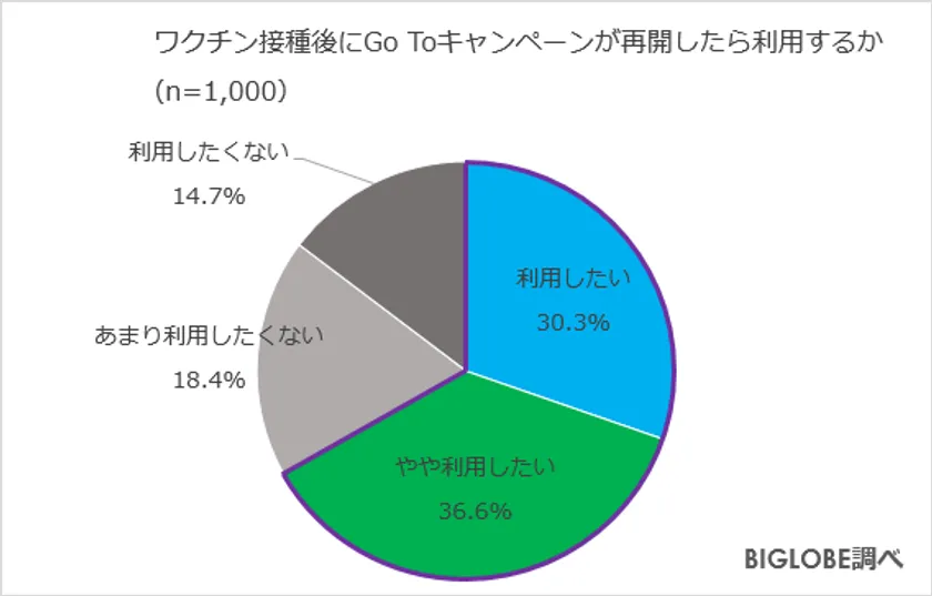 また、「ワクチン接種後にGo Toキャンペーンが再開したら利用するか」を質問したところ、「利用したい」30.3%、「やや利用したい」(36.6%)を合わせると66.6%と、全体の7割弱がGo Toキャンペーンの利用に積極的という結果になった。