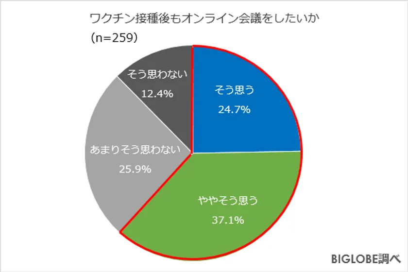 また、オンライン会議をしている全国の20代から60代の男女259人に、「ワクチン接種後もオンライン会議をしたいと思うか」と質問したところ、「そう思う」(24.7%)と「ややそう思う」(37.1%)が約6割に達した。
