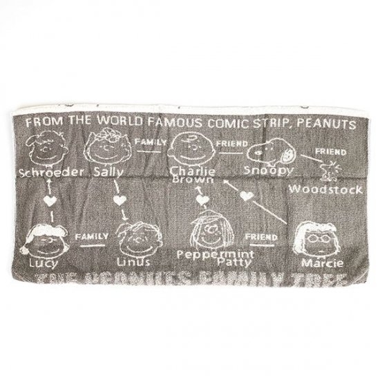 最近人気の、ブラザーズデザインもご用意しています。ベージュのタオル地に、スヌーピーの家系図がデザインされています。パパやママまでいるレアなデザインですね。