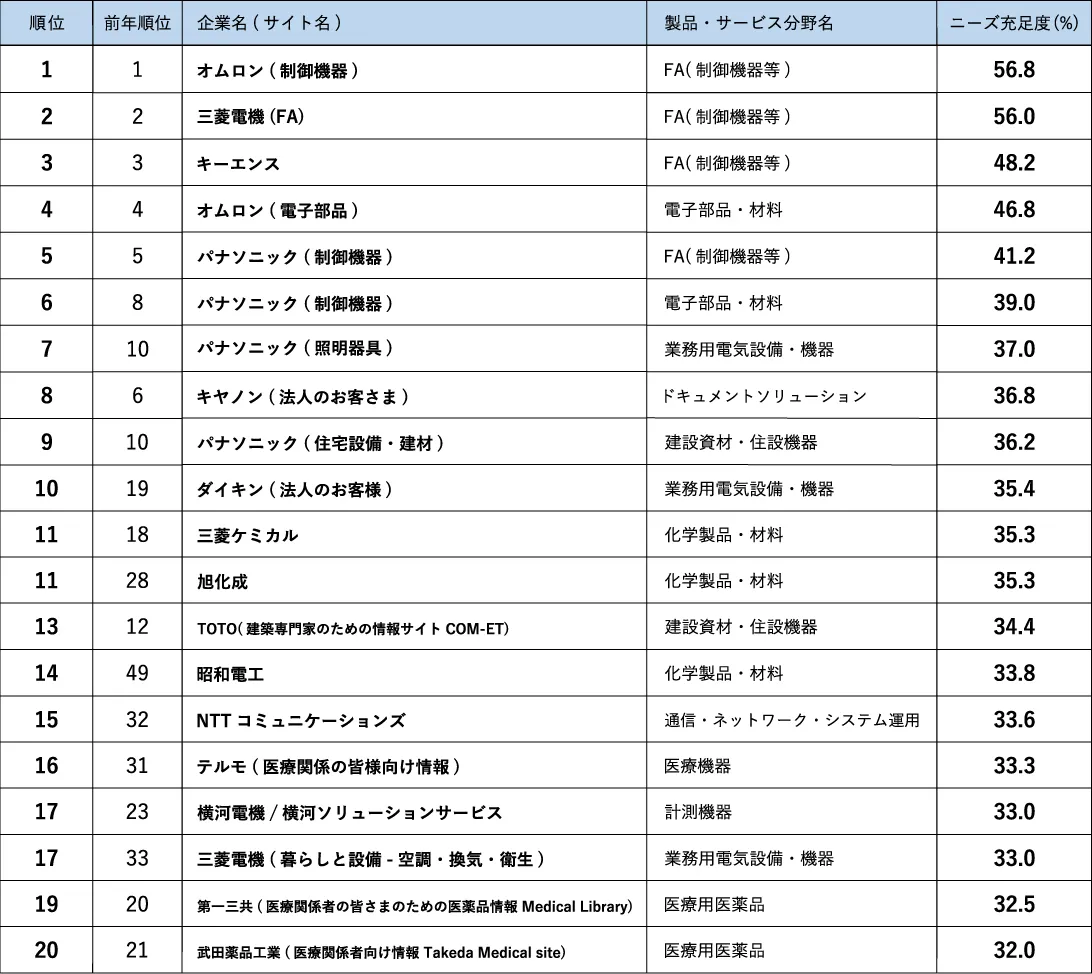 ターゲット(該当する製品・サービスの購入関与者)に占めるニーズ充足者の割合は、オムロン(制御機器)が56.8%で15年連続トップとなりました。次いで三菱電機(FA)が56.0%、キーエンスが48.2%とFA(制御機器等)分野のサイトが上位に並びました【表1】。