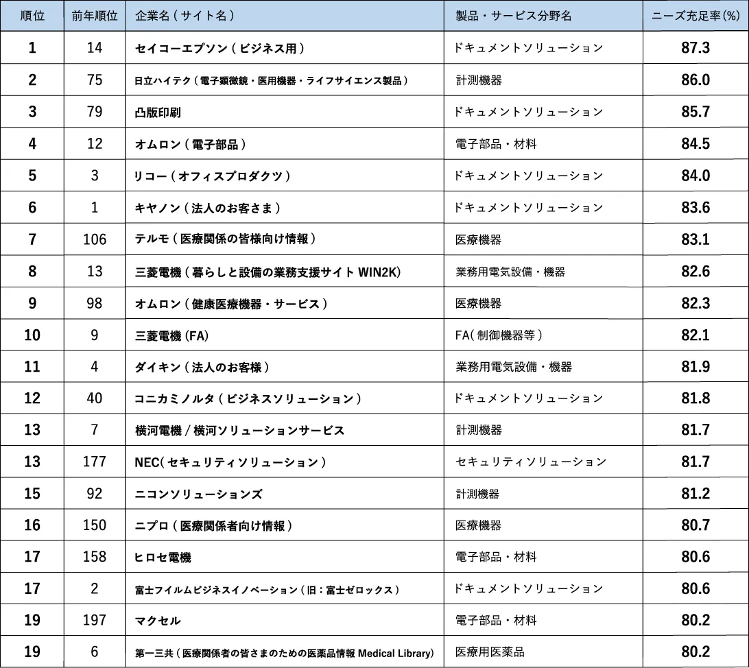 上位にはドキュメントソリューションや医療機器分野のサイトが多く並びました。また医療機器分野のサイトは前回調査と比べ大幅に順位が向上しています。