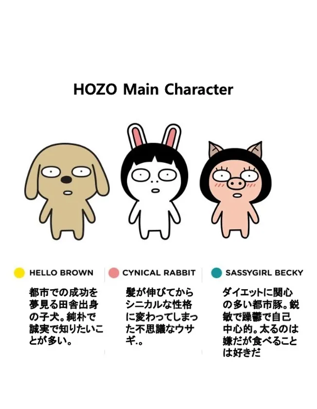 HOZO作家のオリジナルキャラクターは、ハローブラウン(HELLO BROWN)やシニカルウサギ(CYNICAL RABBIT)など、才気あふれるユーモアと日常を洞察するエピソードで、韓国の若者たちの深い共感を得ています。