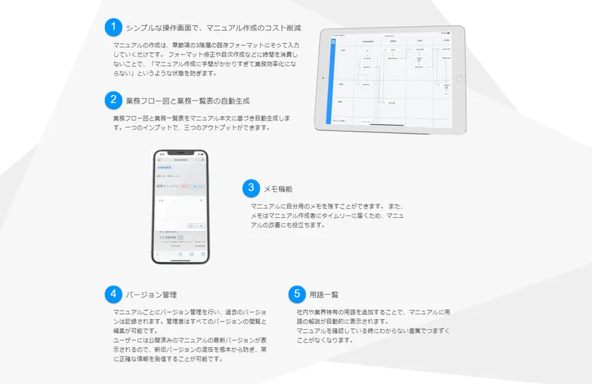 ・章節項の3階層の既存フォーマットにそってマニュアルを入力するだけで作成できるので、マニュアル作成のコストを削減します。