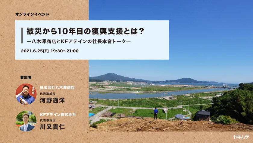 ミュージックセキュリティーズ株式会社(本社:東京都港区、代表:小松 真実)は、東日本大震災から10年が経った今、「次の10年も共に歩こう」をキーワードに、今必要な復興支援について知ってもらうため、東北の被災企業の中から、現在当社のインパクト投資プラットフォーム セキュリテでファンドを組成し募集中の食品製造業 八木澤商店の河野 通洋社長と、塗料メーカー KFアテインの川又 貴仁社長をゲストに、2021年6月25日(金)、オンラインセミナーを開催いたします。