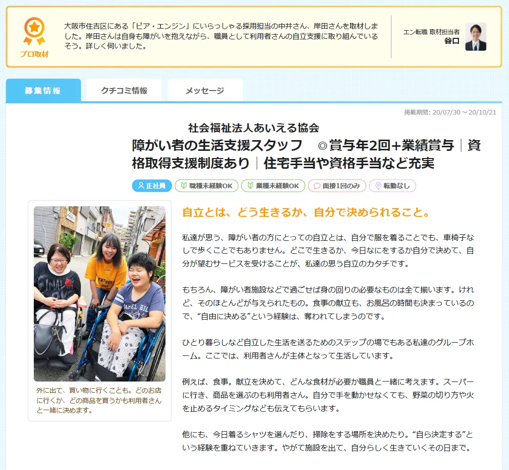 人材採用・入社後活躍のエン・ジャパン株式会社(本社:東京都新宿区、代表取締役社長:鈴木孝二)は、全国の求人広告を扱うメディアや販売代理店が加盟する「全国求人情報協会」が主催する「求人広告賞2020」の求人サイト部門で求人広告賞を受賞いたしました。当該作品は、日本最大級の総合求人サイト『エン転職』(https://employment.en-japan.com/)に掲載された、社会福祉法人あいえる協会(事業所:大阪府大阪市、理事長:古田朋也)の生活支援スタッフ募集の求人広告です。