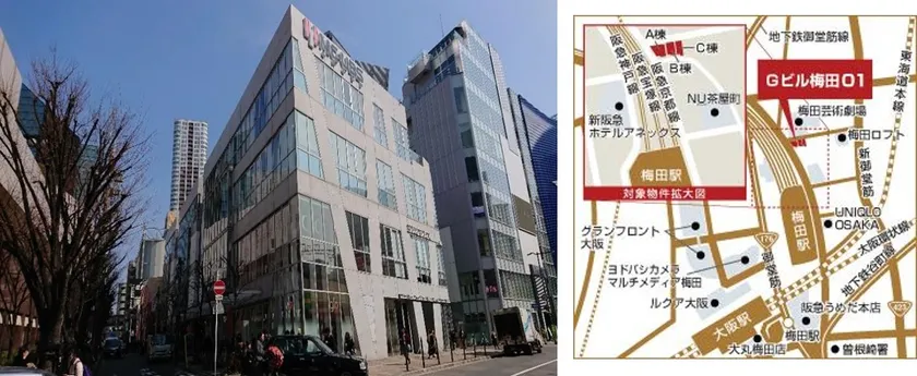 Gビル梅田01(アーバンテラス茶屋町)はA~C棟の3棟からなり、JR「大阪駅」、大阪メトロ「梅田駅」、阪急・阪神「大阪梅田駅」等の計12路線が乗り入れる大阪を代表するターミナル駅至近の茶屋町エリアに位置する商業施設です。周辺は若年層向けの高感度ファッションブランドの路面店や飲食店が集積するエリアで、「大阪梅田駅」からの動線において高い視認性を有する角地に立地しています。ファッション・飲食・サービス系テナントが入居する商業施設で、コンクリートやガラスが印象的な外観を有する、茶屋町エリアにおける象徴的な建物です。