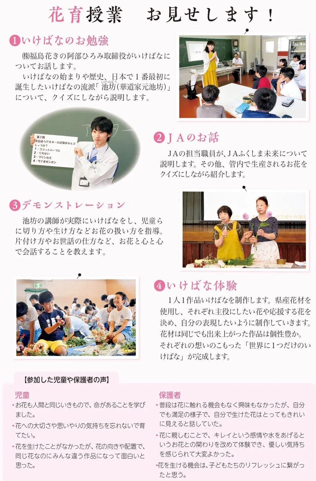 2021年6月14日 14:30JAふくしま未来では、学校教育支援事業の一環で、日本の伝統文化や地元産業への理解を深めてもらう取り組みとして実施している「花育」の、令和3年度第1回目の授業を実施します。