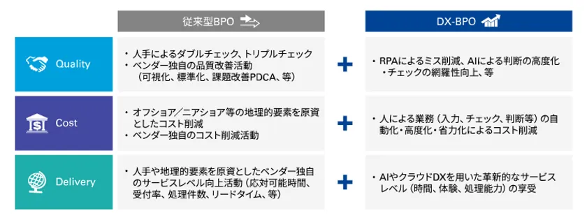 KPMGコンサルティングでは、BPOのあるべき姿としてDXを融合させた戦略的デジタルBPO(DX-BPO)を提言しています。当社は、業務プロセスのDXとBPOをハイブリッドに組み合わせて「DX-BPO」化することにより、従来型の労働集約的BPOと比較し、QCDすべての面でメリットを享受でき、企業の競争力を一層高めることが可能であると考えます。