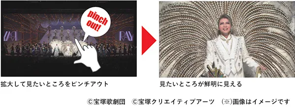 「8Kウルトラズーム」は、8Kで撮影した映像を複数の2Kの映像にリアルタイムに分割して配信します。視聴時にお手持ちのスマートフォンに映る映像を、スワイプ、ピンチインやピンチアウトすることで、見たい部分の映像を従来よりも高画質な映像としてズームして視聴できます。これを利用すると、ライブ映像を高画質かつ視聴しやすいズーム映像で楽しむことができ、スターの表情や細かいしぐさ、および衣装なども見逃すことがありません。