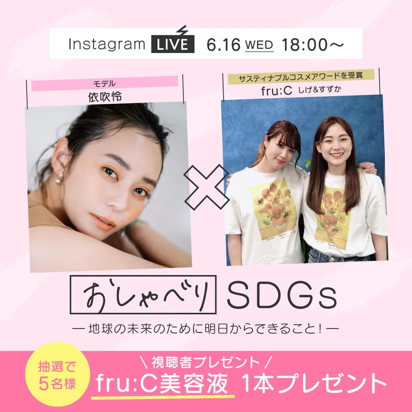 フルーツ由来 新発想ビタミンC美容液「fru:C」を販売する株式会社エクラ(本社:東京都新宿区、代表取締役会長:本多 智史)は、身近で明日からできるSDGsなお話をお届けするインスタライブ『おしゃべりSDGs』を、ゲストにファッションモデルの依吹 怜さんを迎え2021年6月16日(水)に開催します。