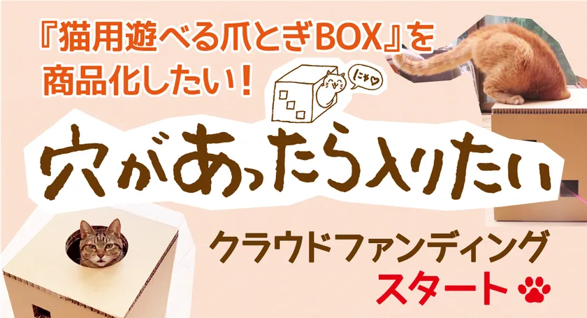 猫用遊べる爪とぎボックス【穴があったら入りたい】は、地元由来の土産品販売会社ゴシンボクと、段ボール専門の日本セキソー株式会社がコラボして製品化を目指しています。