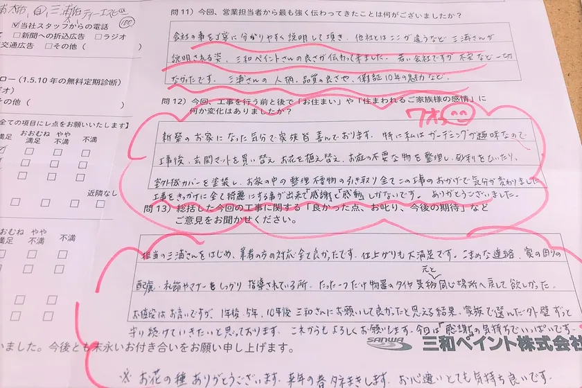 三和ペイントでは、塗装工事を手がけさせていただいた全てのお客様にアンケートを依頼。その返信率は87.6%※2、そのうち満足率は83.2%※3を誇り、塗装業界においても顧客満足に対する取り組みはトップクラスです。アンケートを感動/満足/普通/ハートコールと4つに区分し、2018年12月~2022年11月の5ヶ年で満足10,000棟を目指すプロジェクトを実施しています。現在6,368棟※4。全国のお客様に喜んでいただく施工を提供するため、全社員で追いかける経営目標です。また、お客様の心を動かすことができた“感動アンケート”は全社の月例会にて代表の木原が全て朗読し、全社員に感動エピソードを共有。そのエピソードの中からお客様にインタビューをさせていただきものを「パーパスレター」としてYouTubeチャンネルで配信しております。ぜひ外壁塗装リフォームを通して生まれた感動をご覧ください。