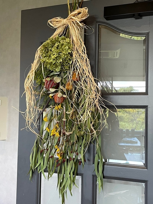 フラワーアレンジ教室では、近年人気の高まっているスワッグ(壁飾り)についてその歴史や意味を学び、南半球のワイルドフラワーをふんだんに使用した華やかなスワッグの製作に取り組みました。